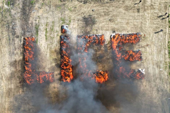 大麻が入った袋で村名「LICE」の文字を作り、ガソリン200リットルを草の山の上にかけて火をつけた。