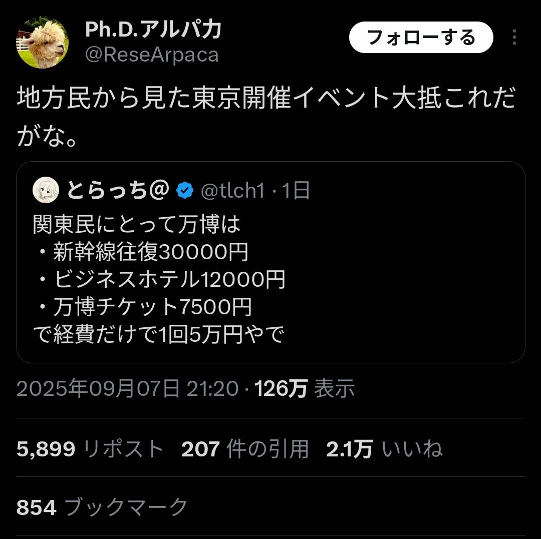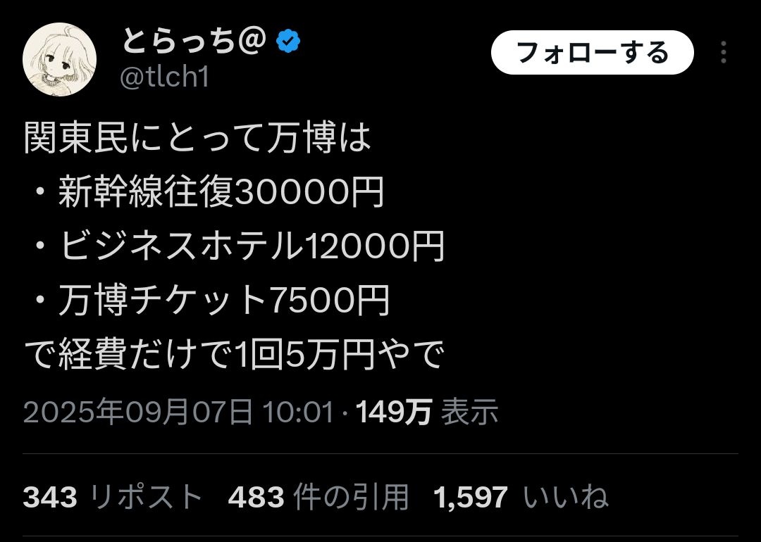 いや、東京から万博行くのに5万もかかるのは流石にキツいかもな。交通費と宿泊費で結構いきそう。 見出しの『万博』がトリガーとなり、作動。 BE[802034645]はこれまでに63スレ/2635レス分、スクリプト加速を記録している。