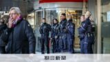 ドイツ西部のゲルゼンキルヘンで30日、盗難事件があった銀行の前で警備する警察官=AP