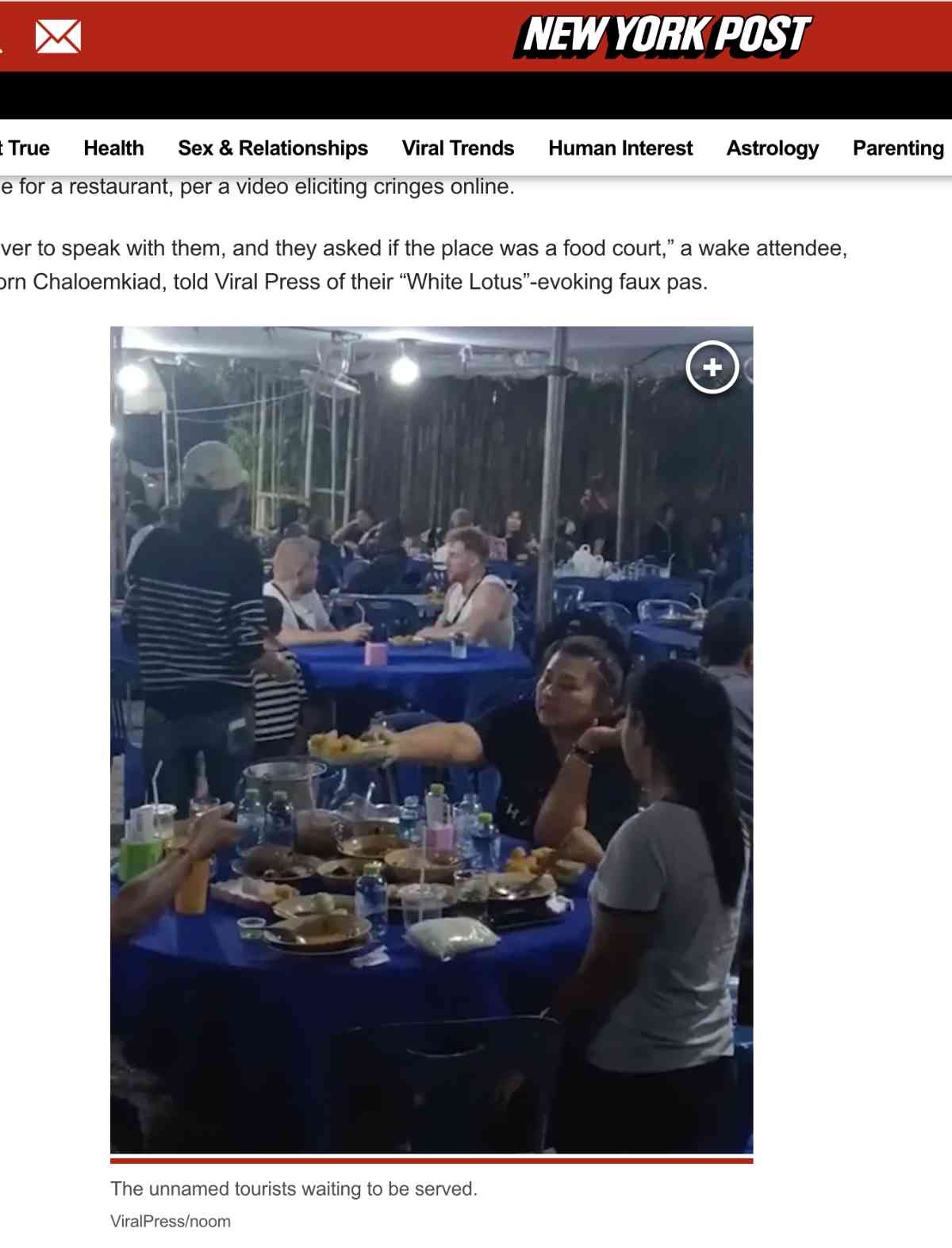 米「ニューヨーク・ポスト」紙によると、この事件はタイのナコン・シー・タムラートで起きた。2人組の観光客は、おいしそうな香りに引き寄せられて会場に入ったものの、そこが葬儀の場だとは知らず、テーブルに座ってメニューを待っていた。観光客はその後、自分たちの間違いに気づき、恥ずかしがりながら謝罪したという。