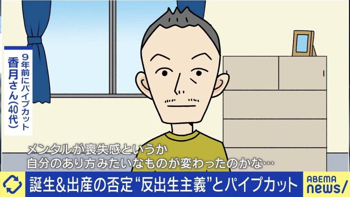 YouTuberの大チャンネルさんは、4年前にパイプカット手術を受けた。中学時代に精神疾患をわずらい、自らの人生に絶望。20代前半で自身の病気に加え、新型コロナやウクライナでさらに社会への強い不満と不安が強まり、反出生主義思想を抱いた。24歳で災害や戦争のリスクがある社会で子どもを産みたくないと、パイプカット手術を実施。27歳になり、子どもができてしまうという不安から解放され、「100%やってよかった」と話す。