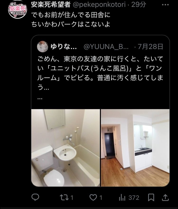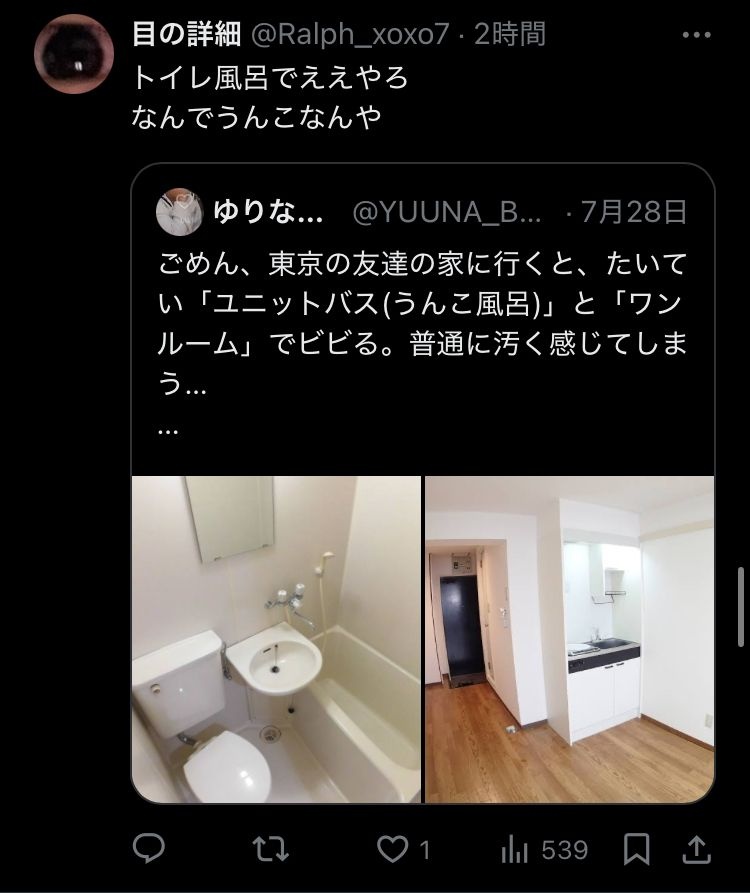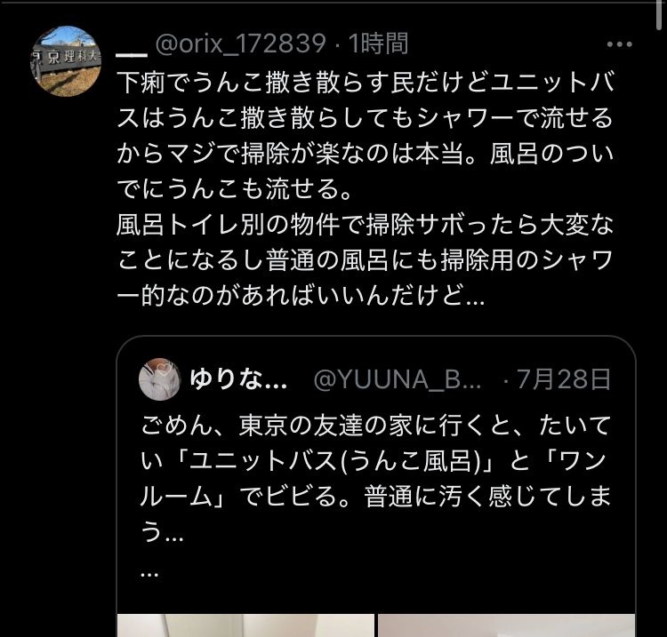 ごめん、東京の友達の家に行くと、たいてい「ユニットバス(うんこ風呂)」と「ワンルーム」でビビる。普通に汚く感じてしまう…こんな独房みたいな部屋で「掃除が楽」といって酸っぱい葡萄してるの見てすごく哀れになった