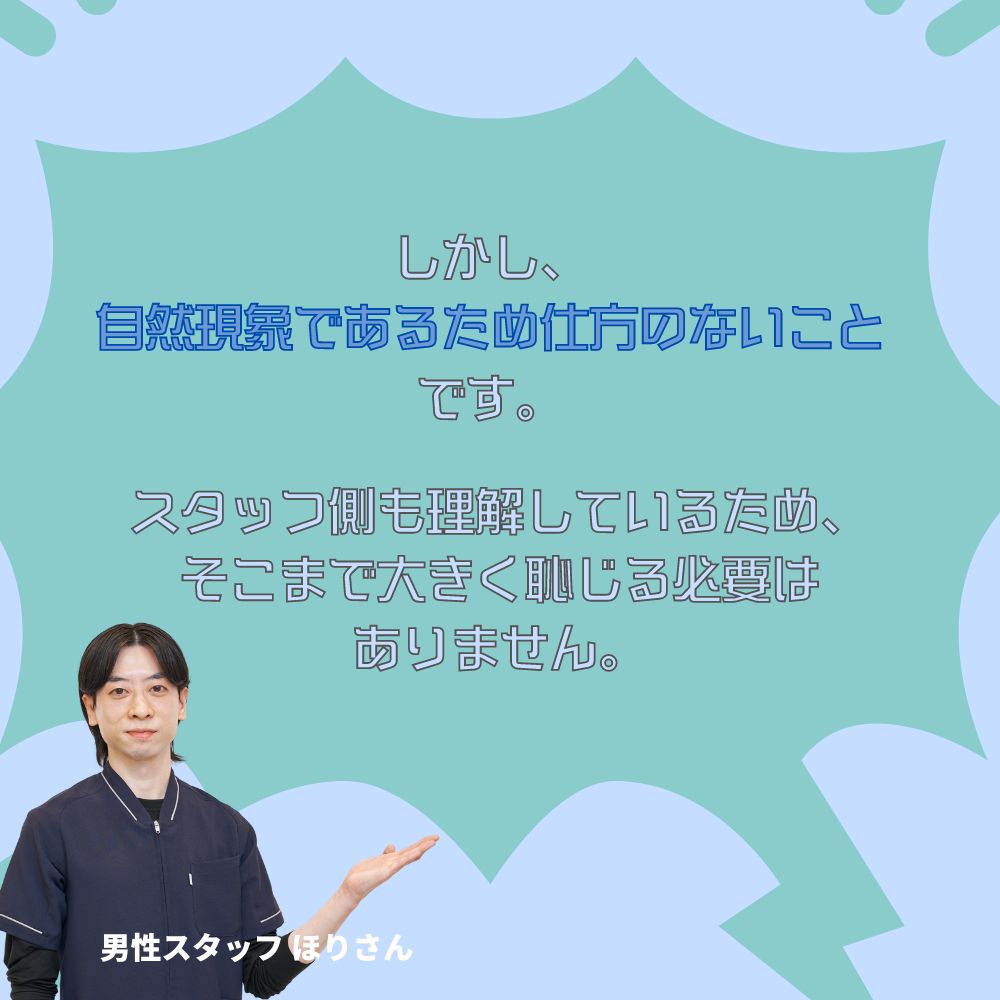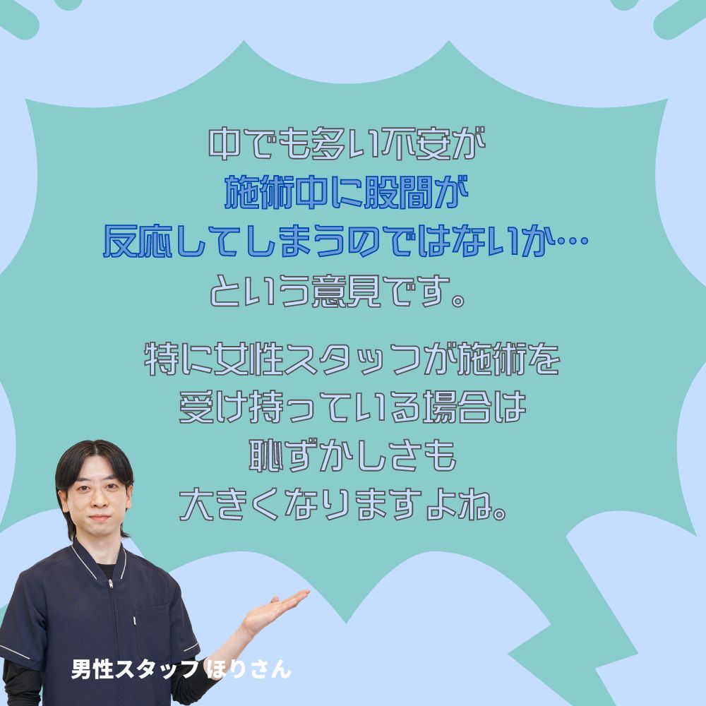 スタッフ側も理解しているのでそこまで恥じる必要はありません✨それでも気になる方は、施術スタッフを男性にしてもらうなど対処してもらいましょう🙆♂