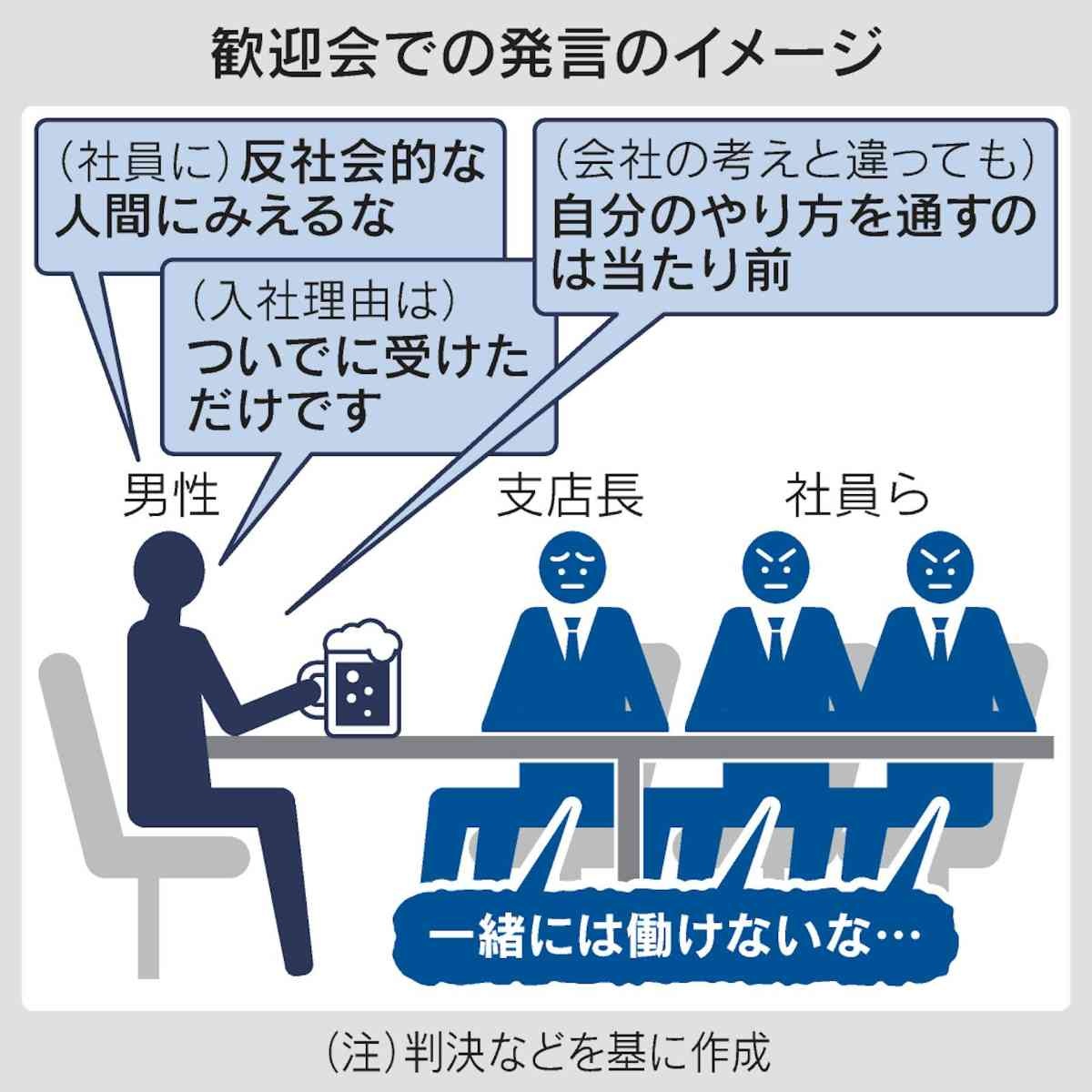週明け、支店長は自ら参加者のヒアリングを始め、男性の知らないところで言動の「備忘録」が作られた。「(特定の社員に対する)『反社会的な人間に見える』などの暴言」「入社理由は『ついでに受けただけ』」「上司の名前を呼び捨てで連呼」――。会社の方針と違っても自分のやり方を通すのは当たり前、との発言もあったとされた。