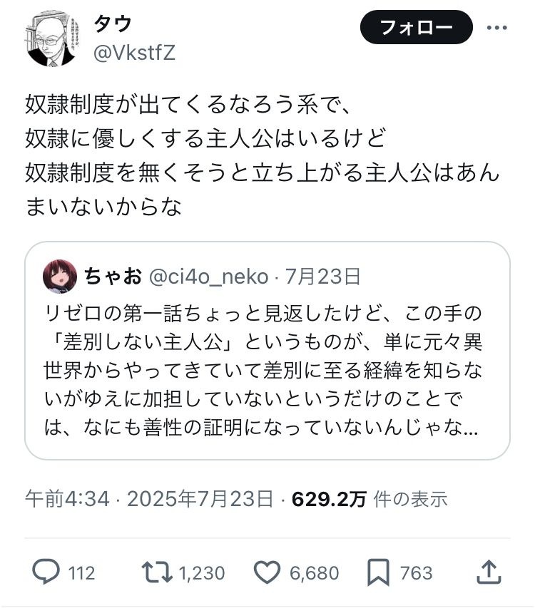 なろう系に限らず奴隷制出てくる作品の主役も奴隷制度の廃止をしようとしてる作品多くはない気がするし