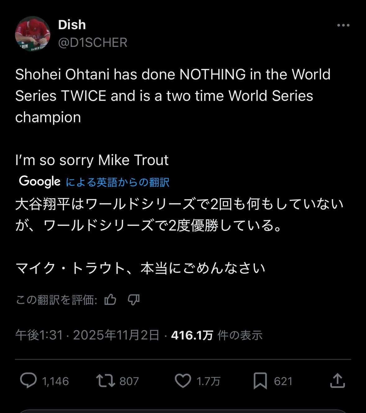 いや、ワールドシリーズは敵味方含めて大谷のopsが圧倒的1位で終わったけどな