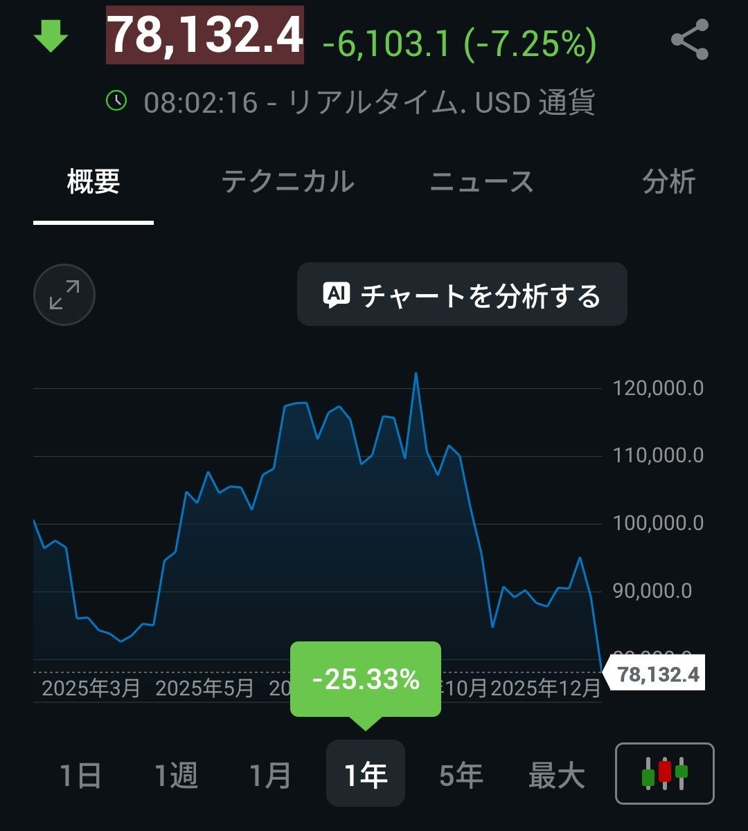-5,940.81 (7.06%)今日買い手不在でビットコイン8万ドル割れ、ドル安や金急落でも浮上せず