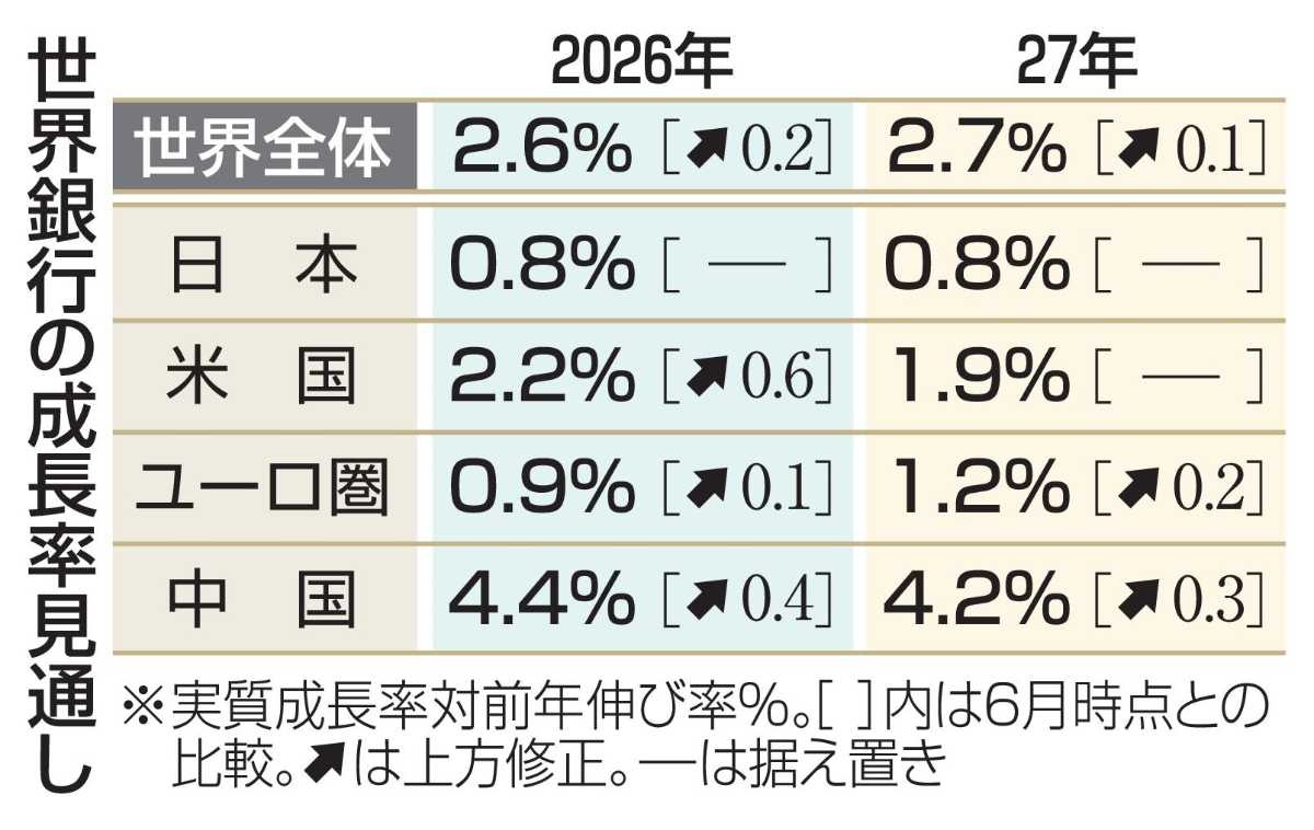 【ワシントン共同】世界銀行は13日公表の最新の世界経済見通しで、2026年の世界全体の成長率を2.6%と予測した。昨年6月時点から0.2ポイントの上方修正。金融緩和や財政拡張策が成長を下支えすると分析した。米国経済の堅調さも反映させた。日本は25年の1.3%成長から、26年は0.8%に減速するとの試算を維持した。外需低迷が要因だ。