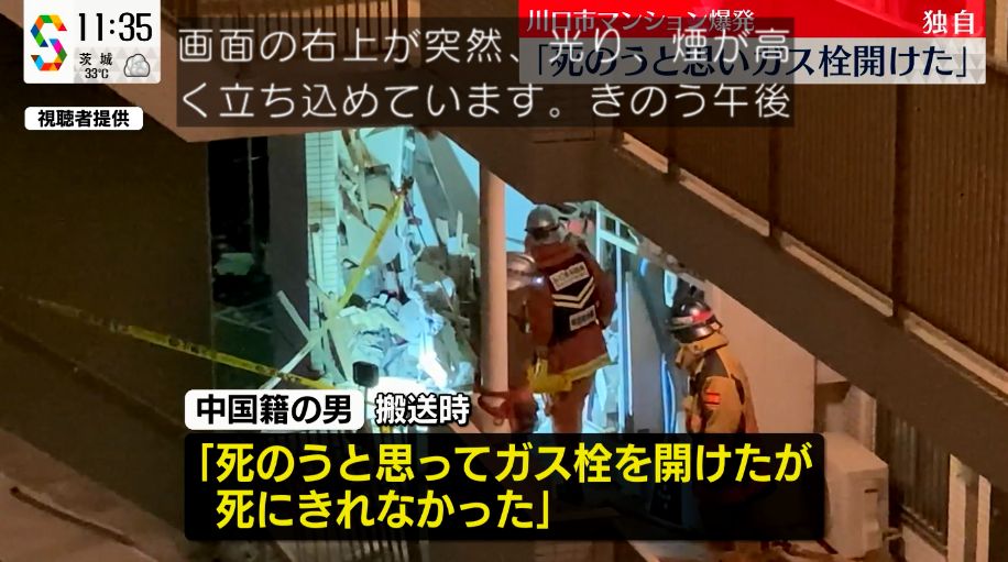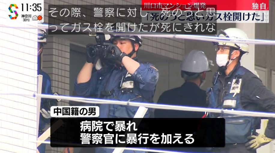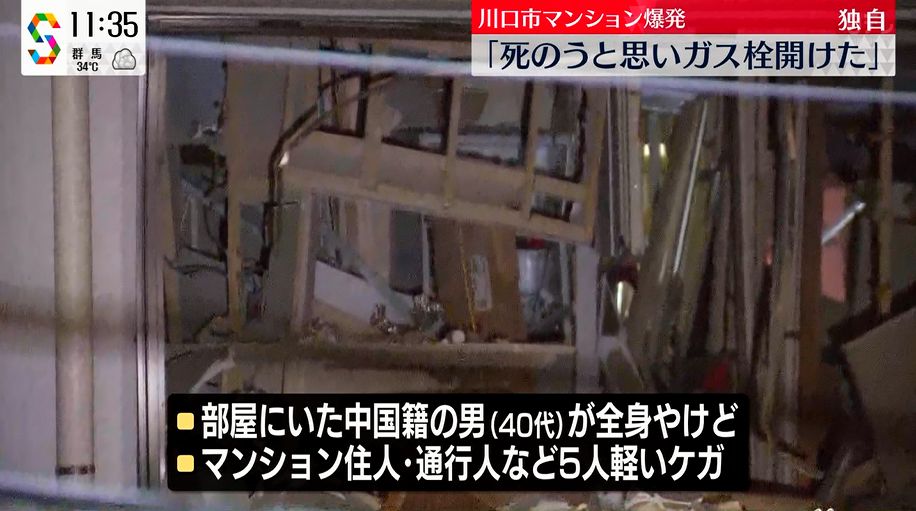中国人「ジサツするか。ガスを開けたままにしよう」→「やめやめ。タバコ吸って気を取り直そ」→大爆発→さら搬送先の病院で暴れて逮捕