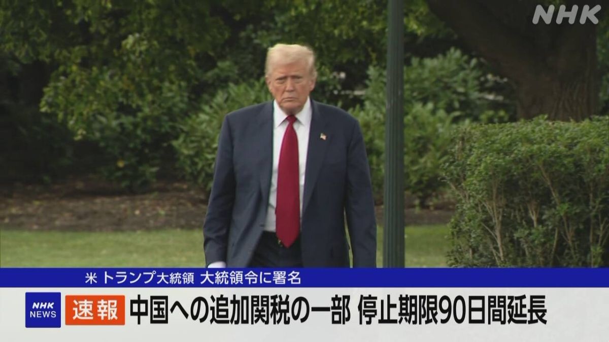 アメリカのホワイトハウスは、中国からの輸入品に対する追加関税の一部について、トランプ大統領が停止期限を90日間、延長する大統領令に署名したと発表しました。中国側もアメリカからの輸入品への一部の関税措置などについて停止期限の延長を発表し、両国は協議を続けることになりました。