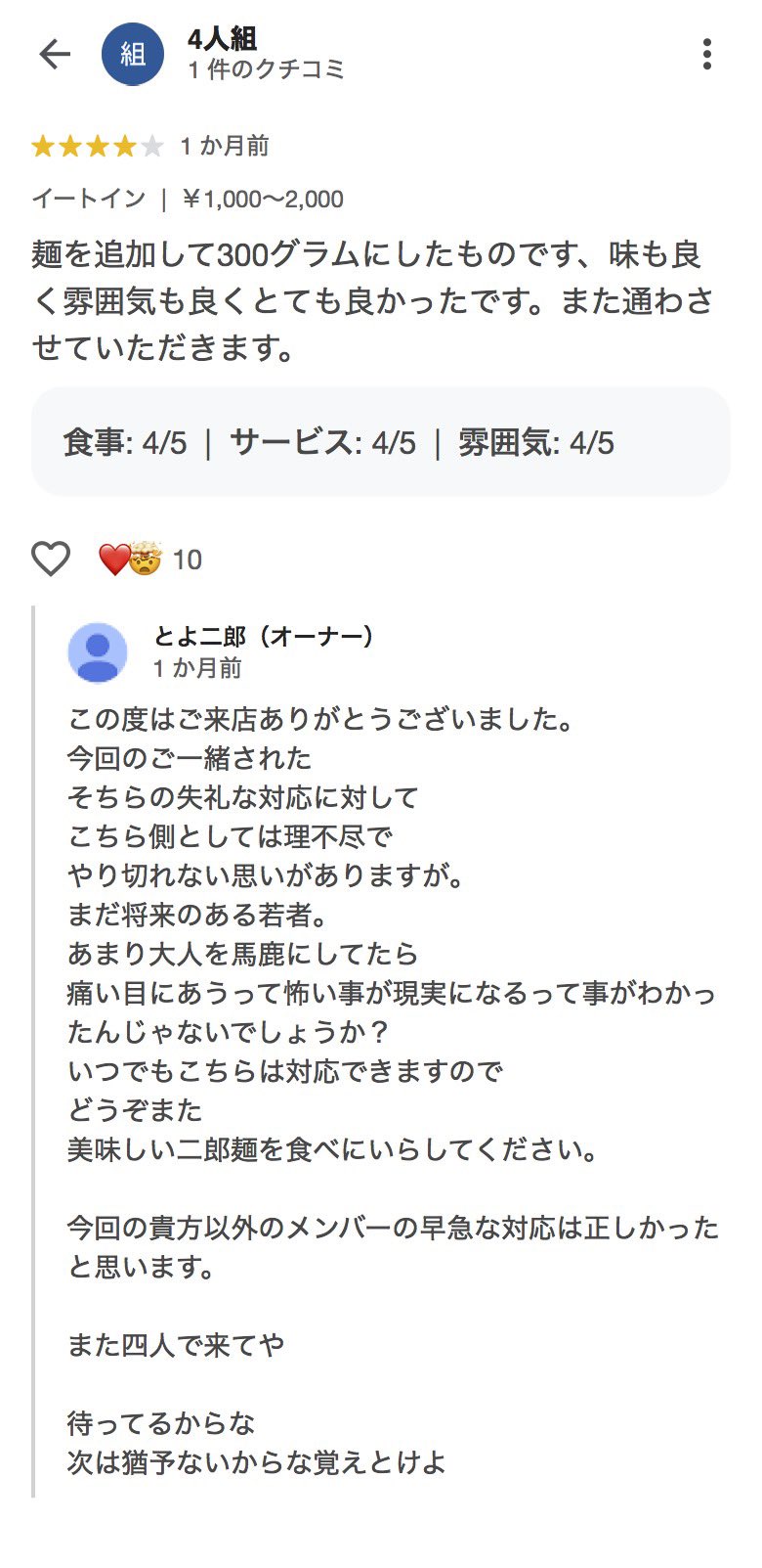 店が「しょうもない口コミ書いてたら探すで?ボコボコにしたる」等のリプライを送る