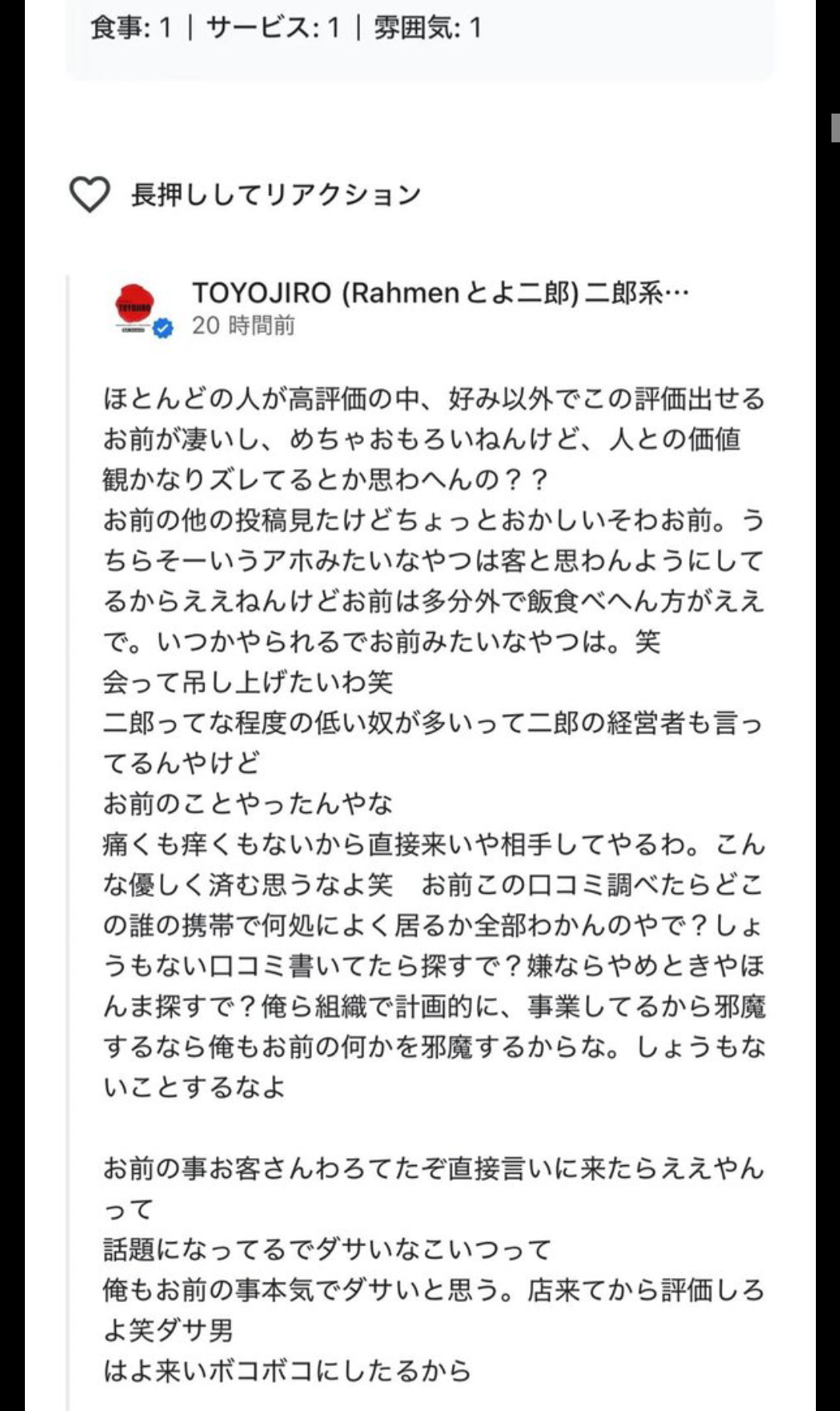 店が「しょうもない口コミ書いてたら探すで?ボコボコにしたる」等のリプライを送る