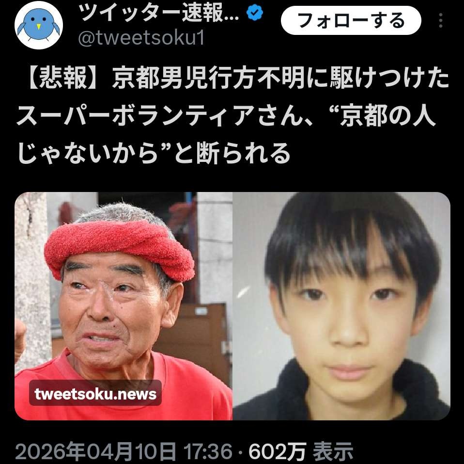 京都ガキ行方不明さん、"何故か"スーパーボランティアの協力を断ってしまうwww