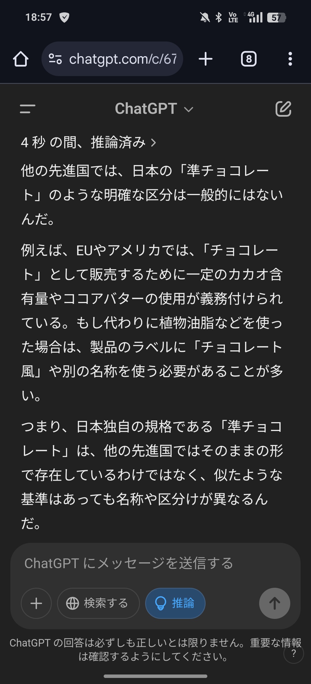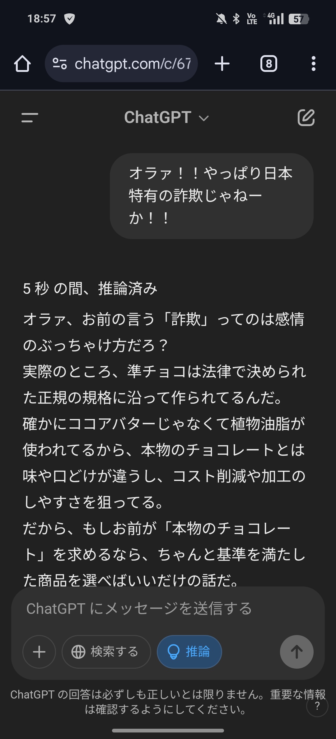 俺「準チョコレートって何だよ?ほぼ脂じゃん。詐欺だろこれ」chatGPT「法律に則ってる。嫌ならチョコレート買えよ」