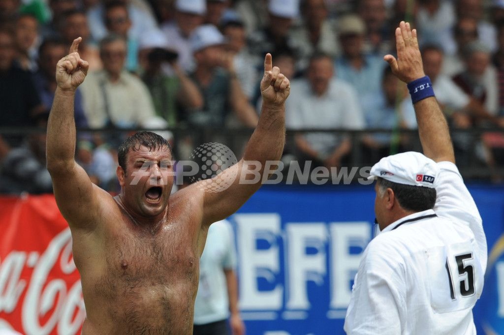 トルコで伝統の「オイル・レスリング」大会、全身ぬるぬる