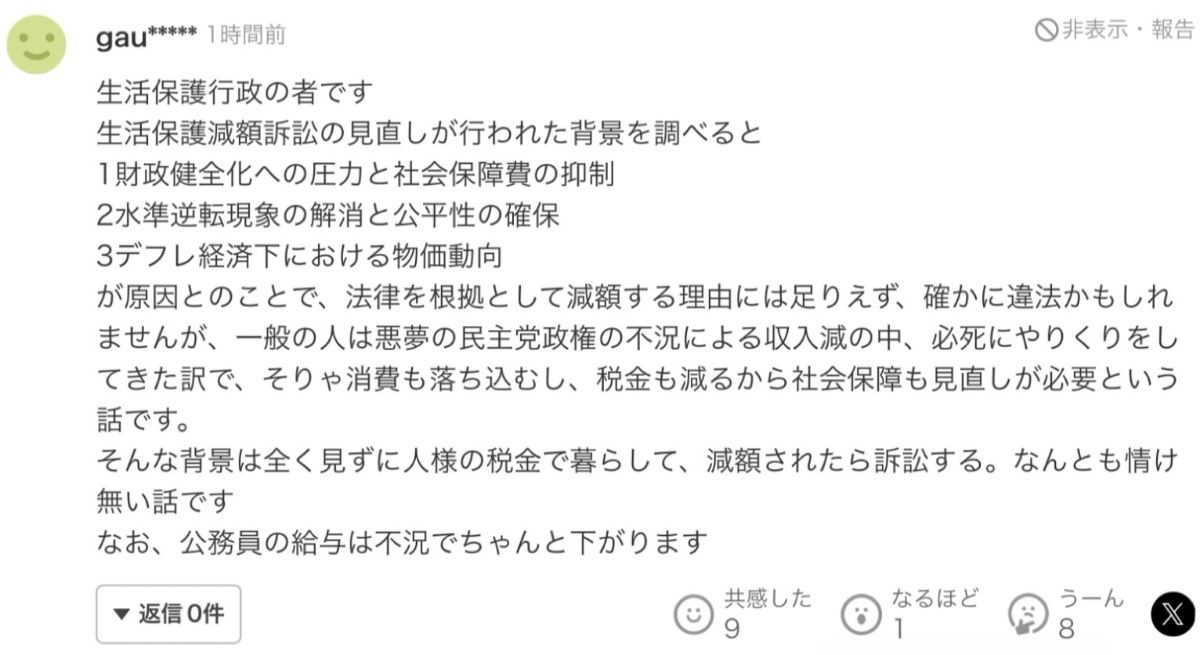 公務員様「生活保護受給者は国の背景は全く見ずに人様の税金で暮らして、減額されたら訴訟する。なんとも情け無い話です」