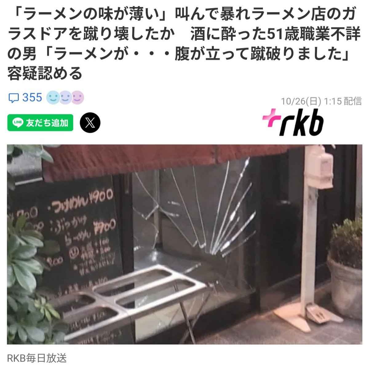 「ラーメンの味が薄い」叫んで暴れラーメン店のガラスドアを蹴り壊したか 酒に酔った51歳職業不詳の男「ラーメンが・・・腹が立って蹴破りました」容疑認める