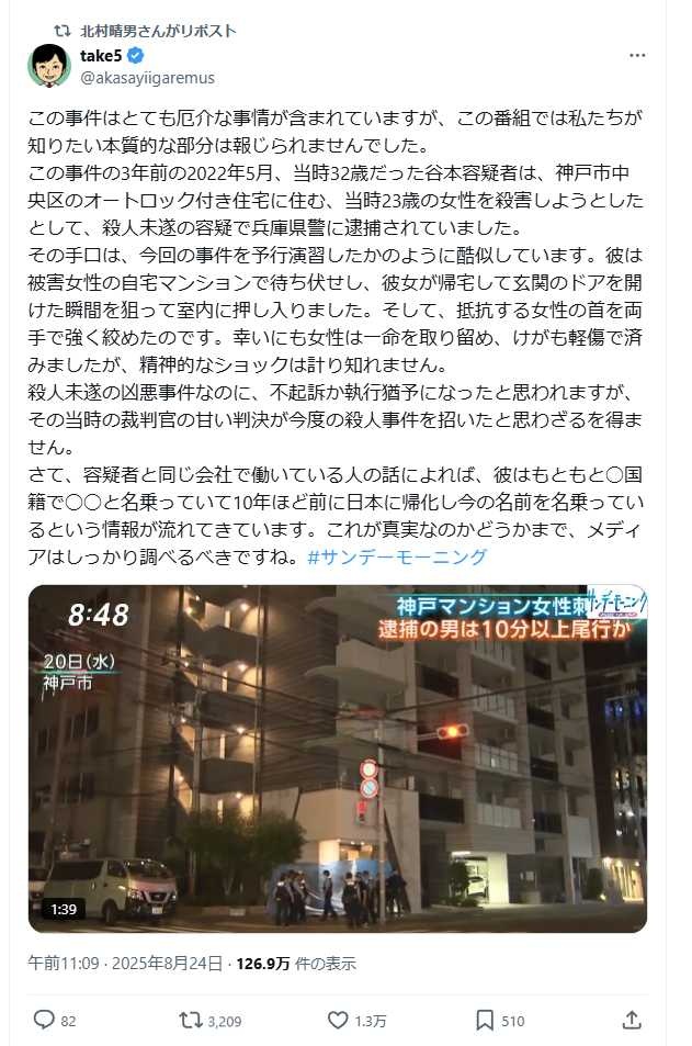 北村晴男参議院議員、神戸女性刺殺容疑者、「犯人の谷本将志容疑者は元中国籍」という投稿を無言でリポスト