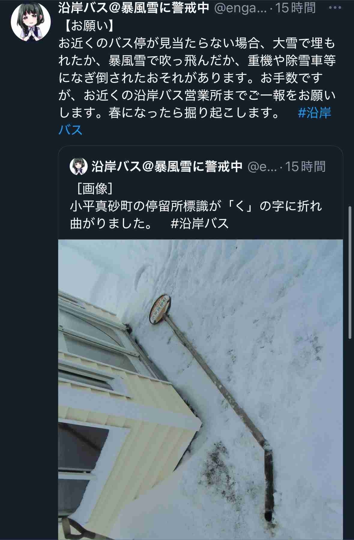 北海道のバス「バス停がない場合、大雪で埋もれた、暴風雪で吹っ飛んだ、除雪車等になぎ倒されたと思うのでご一報を。春に掘り起こします