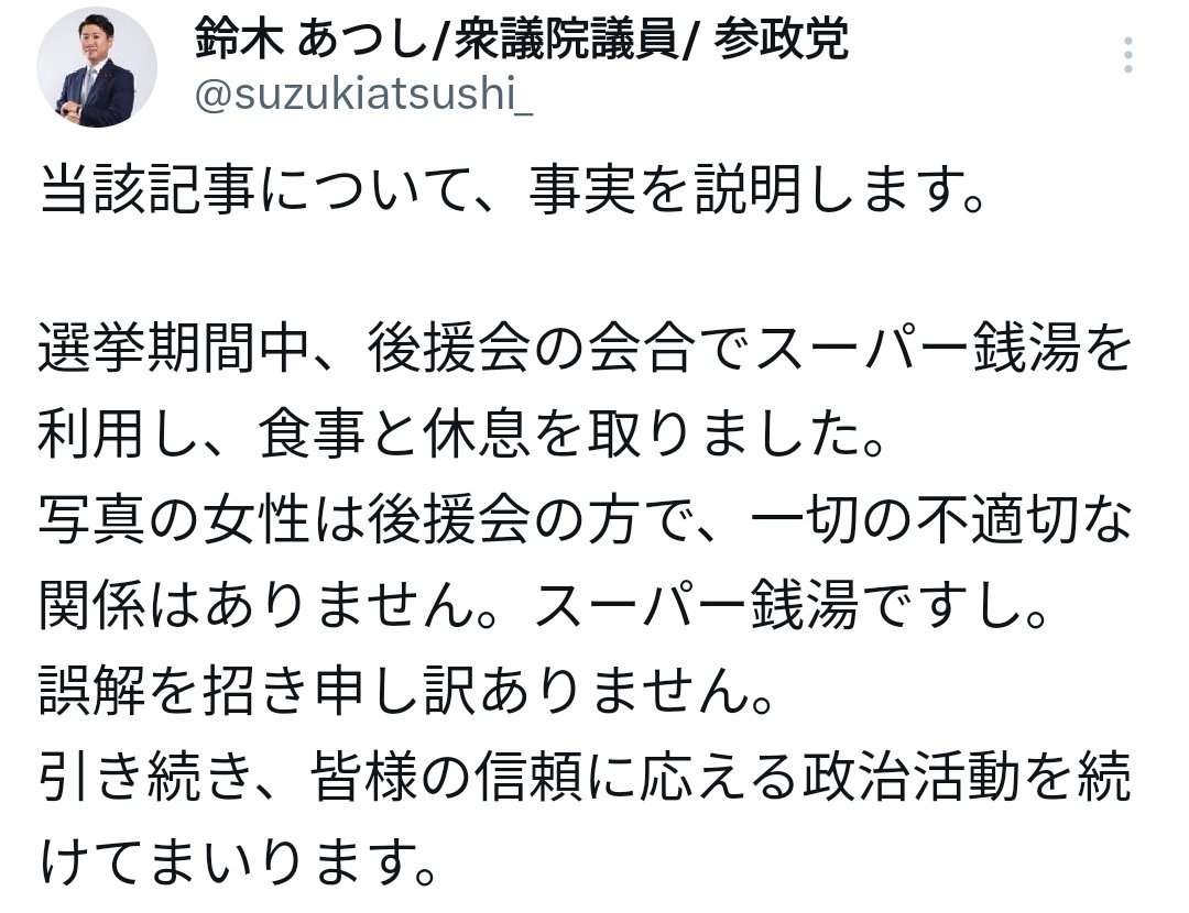 参政党🍊鈴木あつし、不倫報道にピシャリ「温泉行っただけで無実」