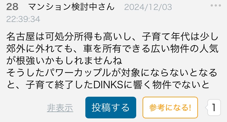 名古屋で不動産やってる人が「名古屋は東京大阪に比べて全然マンションが売れない。みんな郊外の戸建至上主義だし、名古屋人は名駅や栄など都心は住むところじゃないと思ってる」と言ってて、名古屋の住みやすさってそこだなと思う。