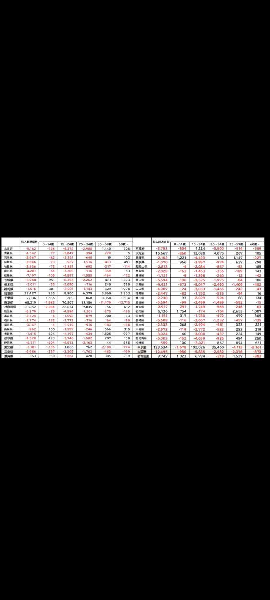 全年代で転入超過してるのは埼玉と千葉のみ