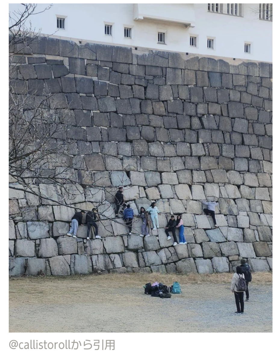 日本の城郭は空襲で焼け落ち、石垣だけが当時の貴重な姿を留める所がほとんど。崩れたり傷つけられたら元に戻せない、又は莫大な補修費がかかります。無許可で登る者には高額罰金を。法整備より先に条例で対応して下さい。ベルサイユに登る者はいません」と引用リプライで非難。日本人ユーザーにも大きく拡散されたというわけだ。