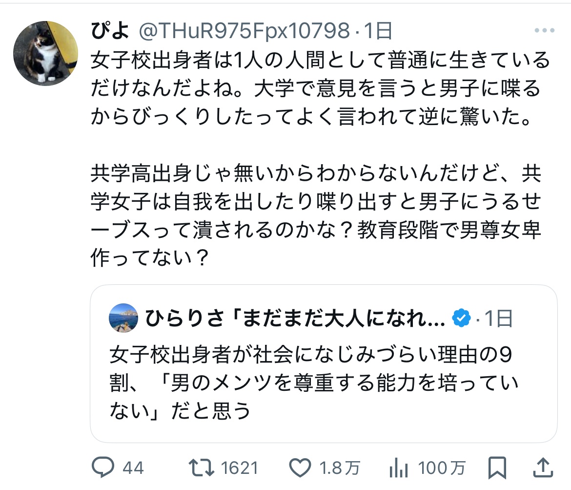 女子高出身女の子「大学行ったら『女子なのに喋るのびっくりした』って言われたことある。教育段階で男尊女卑作ってない?」1.8万いいね