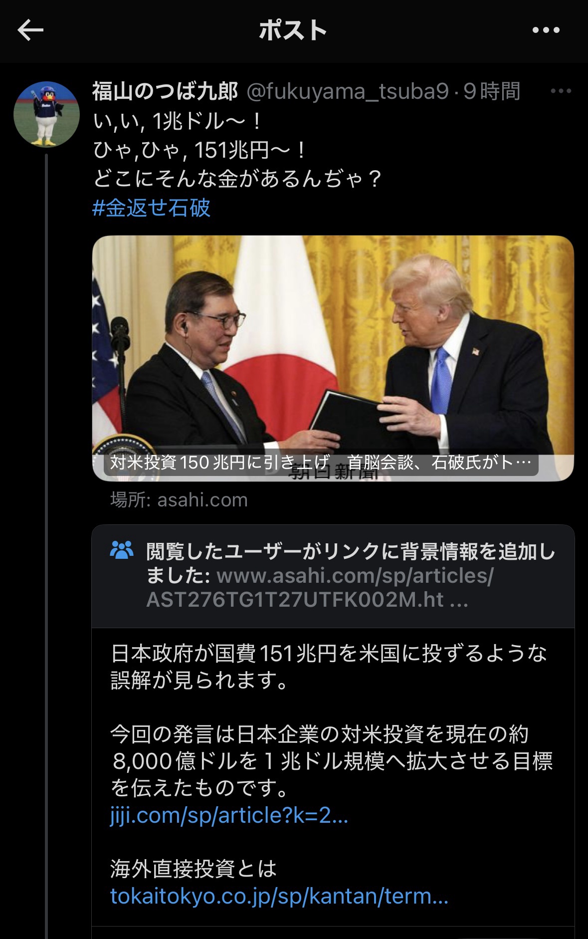 安倍信者ウヨら「アメリカに1兆ドル投資?!俺たちの血税が!!」連呼