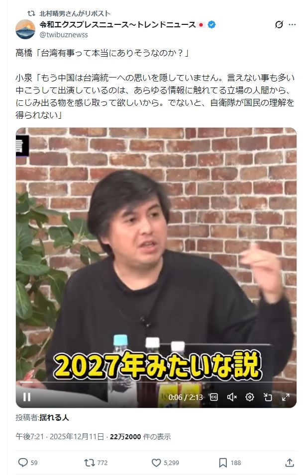 小泉進次郎「中国は台湾統一の意思をすでに隠しておらず、国民が状況を理解しなければ、自衛隊が必要な行動への支持を得られない
