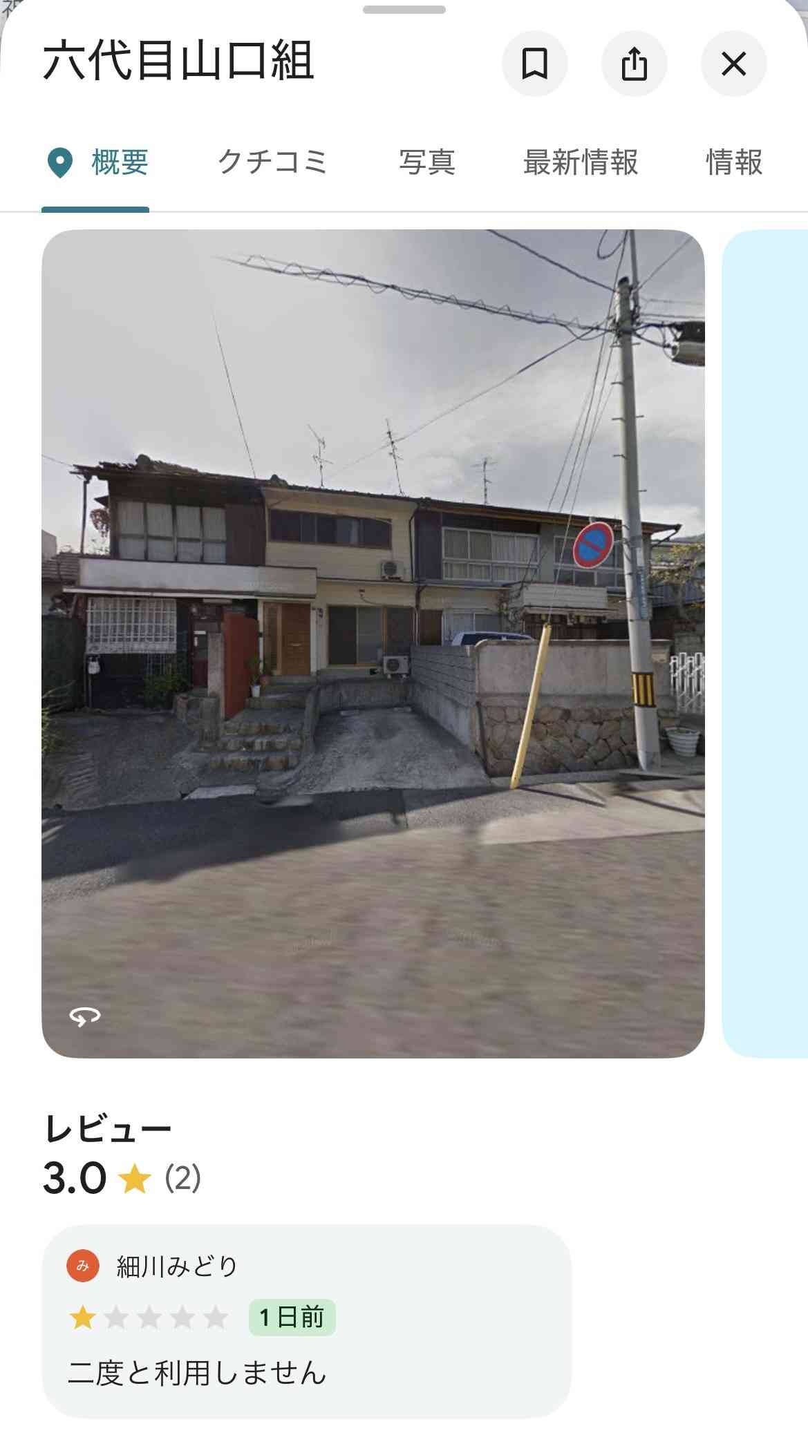 山口組の事務所、Googleマップで星1のレビューをつけられてしまう…