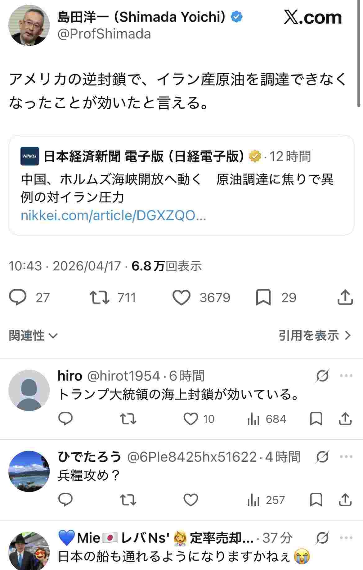 島田洋一「トランプのホルムズ封鎖が中国にダメージを与えてる」