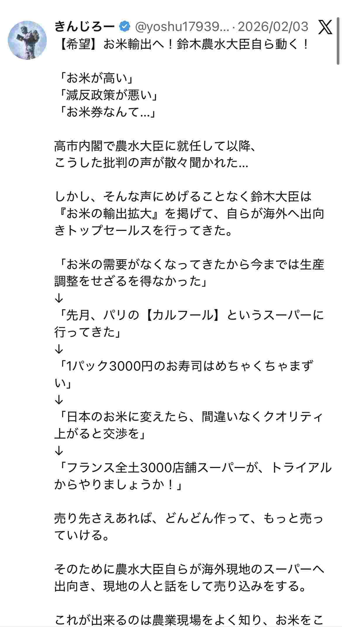 愛国者「農水大臣がお米輸出拡大に動いてます!これでお米価格も安定します!こんな人を待っていた!」輸出したら安くなるんか?