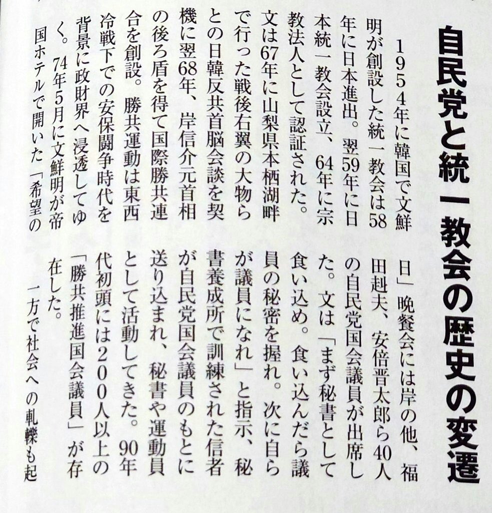 文鮮明「まず秘書として食い込め。食い込んだら議員の秘密を握れ。次に自らが議員になれ」だって。https://twitter.com/NTUY_uncle_bot/status/1546774178392842240