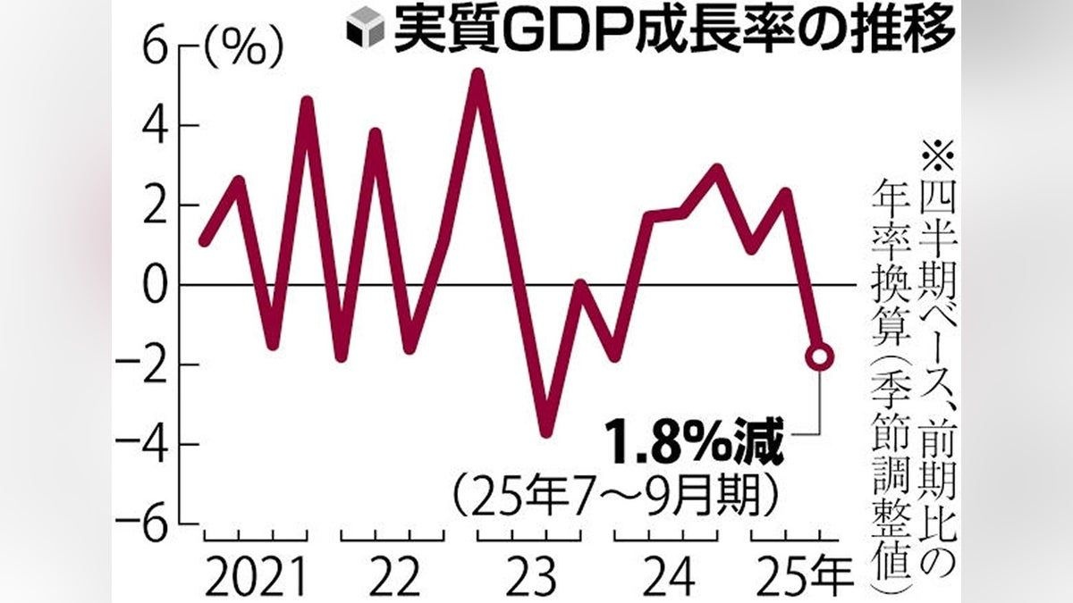 内閣府が17日発表した2025年7~9月期の国内総生産(GDP、季節調整値)の速報値は、物価変動の影響を除いた実質で4~6月期と比べて0・4%減だった。このペースが1年間続くと仮定した年率換算は1・8%減で、6四半期ぶりのマイナス成長となった。4月に発動されたトランプ米政権の高関税政策が大きく響き、米国向けの自動車輸出が落ち込んだ。