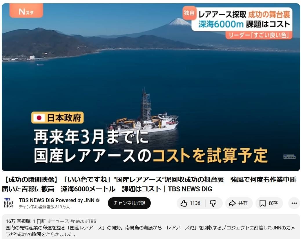 日本「レアアース回収、強風で何度も作業中断しました。コスト試算は2年かかります🥺」