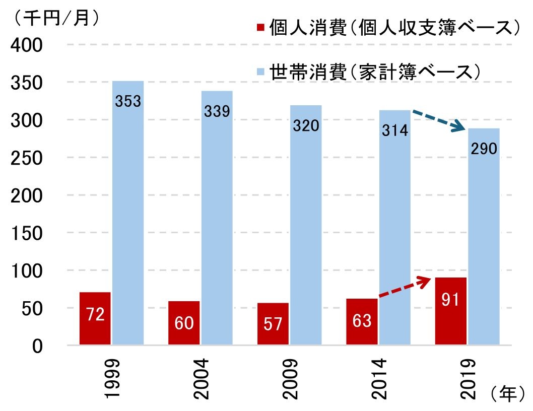 図表5:消費額の推移(家計簿調査と個人収支簿調査の比較)