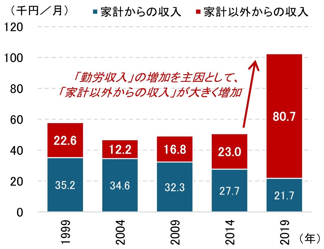 2019年調査では9.1万円/月まで増加しています。世帯全体の消費額が31.4万円/月から29.0万円/月まで減少しているのとは対照的ですね。