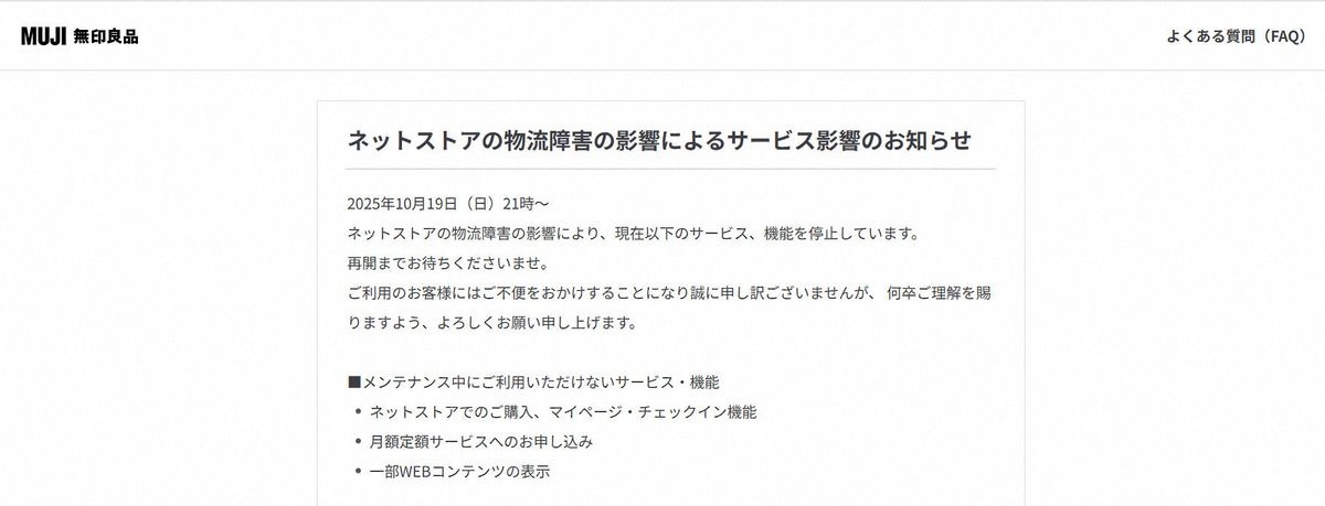 無印良品 ネットストアの物流障害発生 商品購入やマイページへのチェックインなどが停止