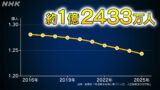 また、外国人を除いた日本人の人口は、1億2065万3227人で、去年の同じ時期と比べて90万8574人、率にして0.75%減りました。