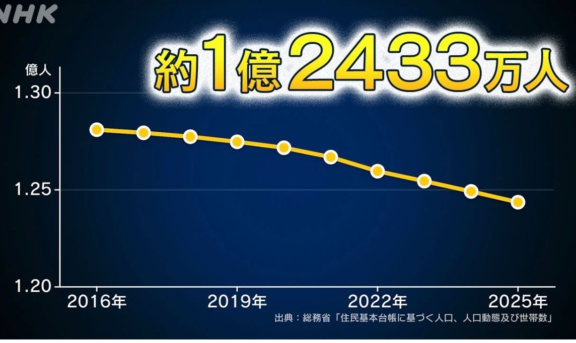 ことし1月1日現在の日本の総人口は、およそ1億2433万人で、去年より55万人余り減りました。このうち日本人の人口は、1億2065万人余りで、16年連続で減少し、調査開始以降、1年間の減少数が初めて90万人を超え、最大となりました。