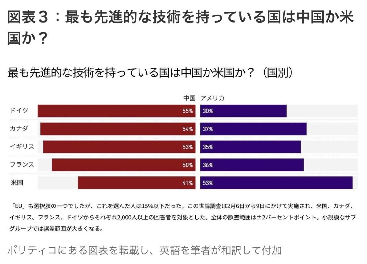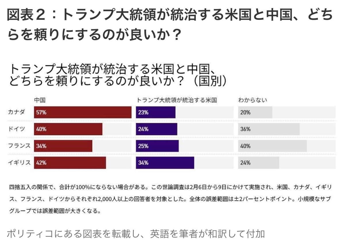 米メディアのポリティコ(POLITICO)はイギリスの世論調査会社パブリック・ファースト(Public First)に依頼して、今年2月6日から9日にかけて米国とそのトップ同盟国(米国、カナダ、イギリス、フランス、ドイツ)を対象として世論調査を行なった。その結果を3月15日に発表したのだが、結果が凄い。