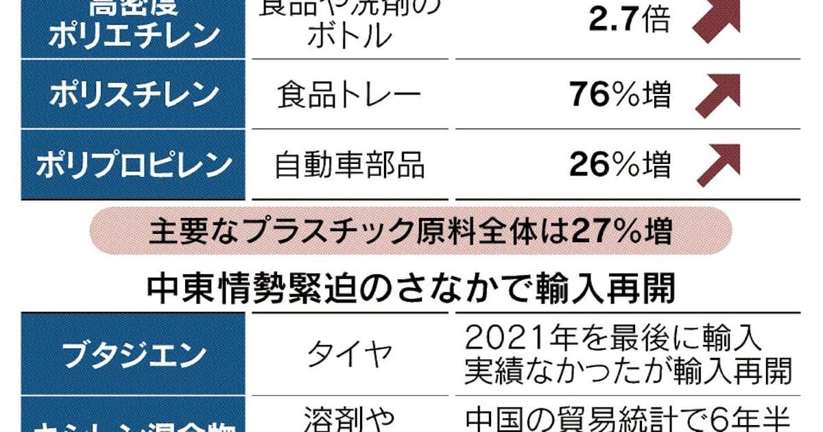 中国からプラ原料3割増 ナフサ危機で代替調達 定着なら日本企業に打撃 - 日本経済新聞