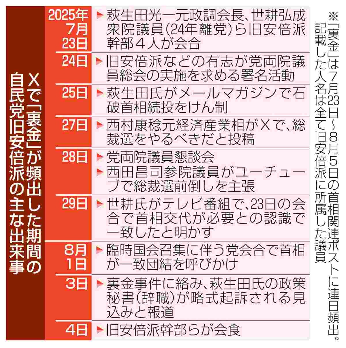 この時期の旧安倍派議員の動きは活発で、7月23日に萩生田光一元政調会長や、離党した世耕弘成衆院議員らが会談し、首相交代の必要性を確認した。