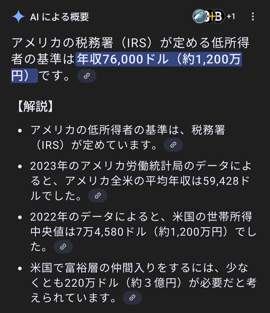 アメリカの物価金が考えると確かに低所得だと思うわ
