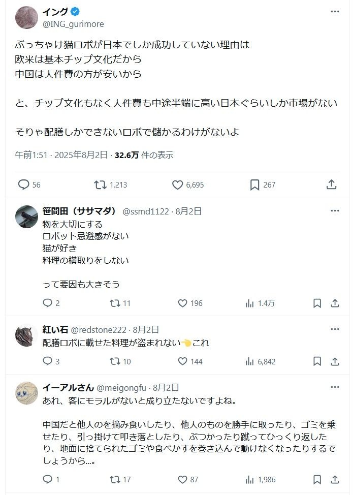 日本人「日本のネコ型配膳ロボットが世界中で活躍して誇らしい😤!!モラルの低い中国じゃ無理😂www」