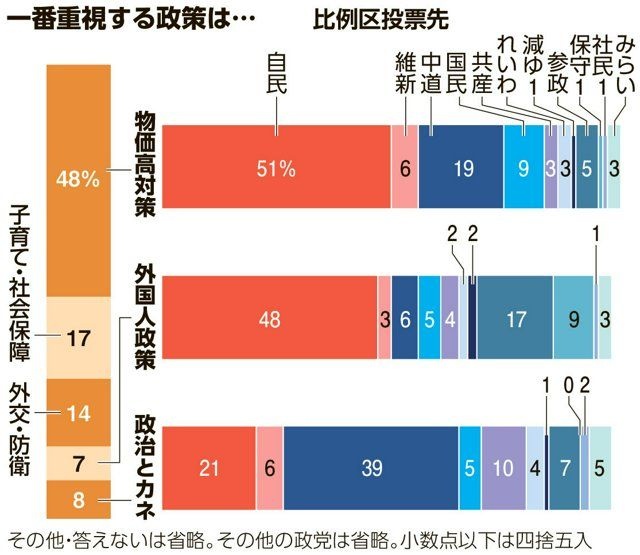 「物価高対策」重視する人の比例区投票先、自民が他党大きく上回る