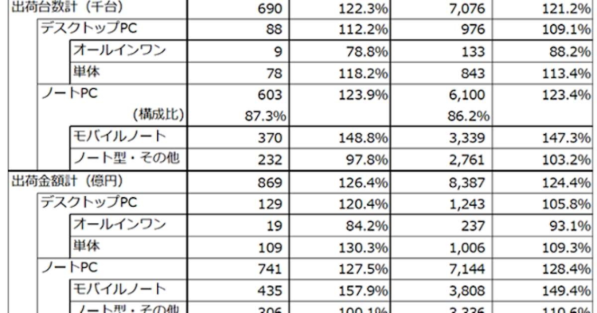 出荷金額は869億円(前年比126.4%)となった。うちデスクトップ:129億円(同120.4%)、ノート型:741億円(同127.5%)であった。