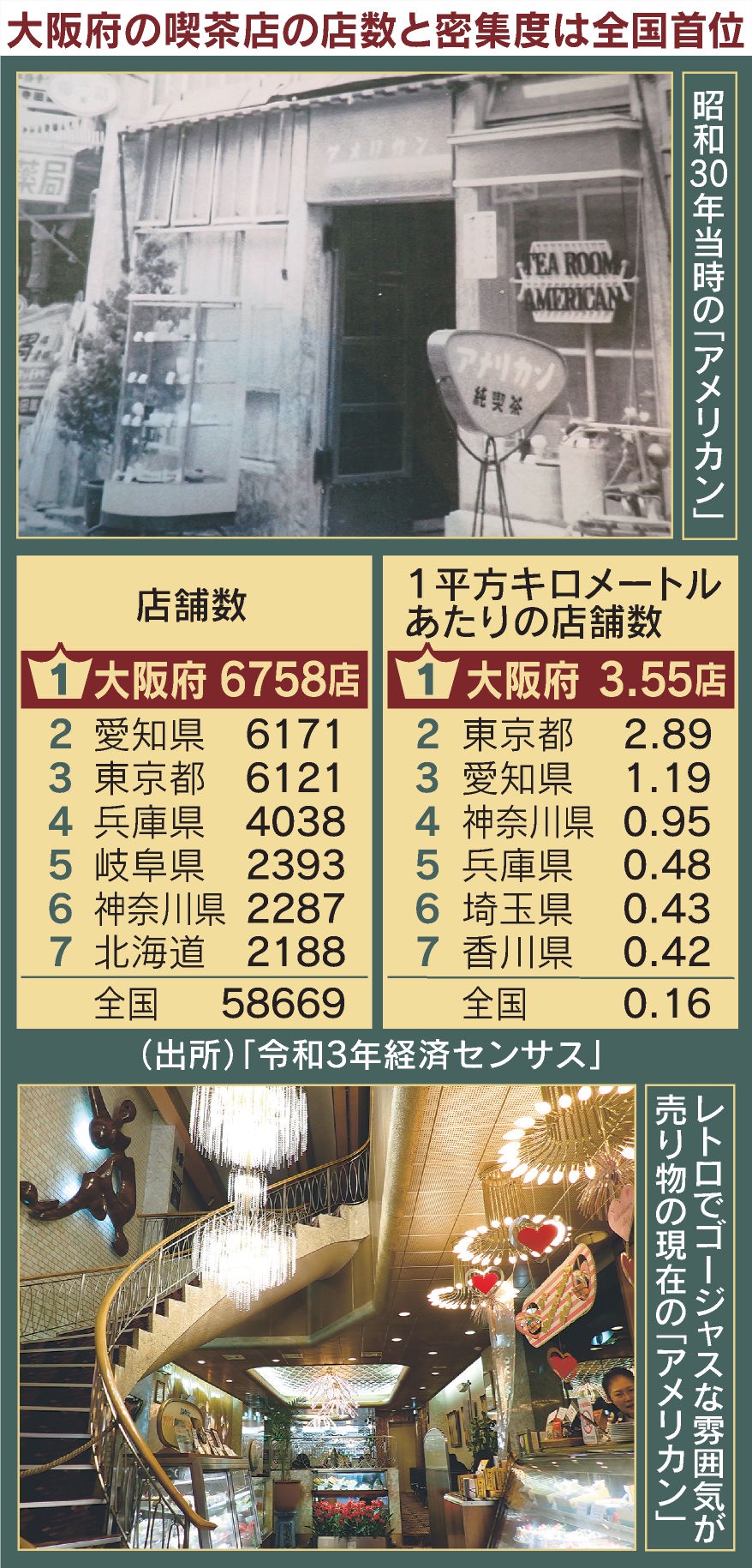 「経済センサス」によると、2021年6月時点の喫茶店数は大阪府が「モーニング」で有名な愛知県(6171店)や人口で1.6倍の東京都(6121店)を上回り、全国で最も多い。1平方キロメートルあたり…