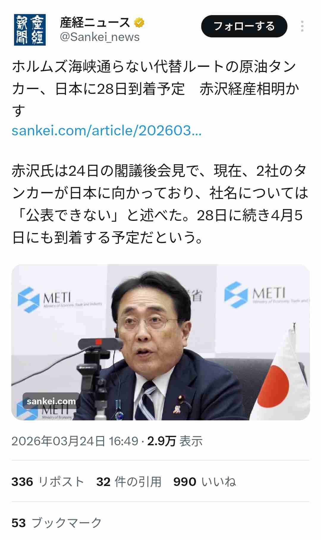 問題は日本側からホルムズ海峡に通過できればすぐ向かえるタンカーはあるんかね